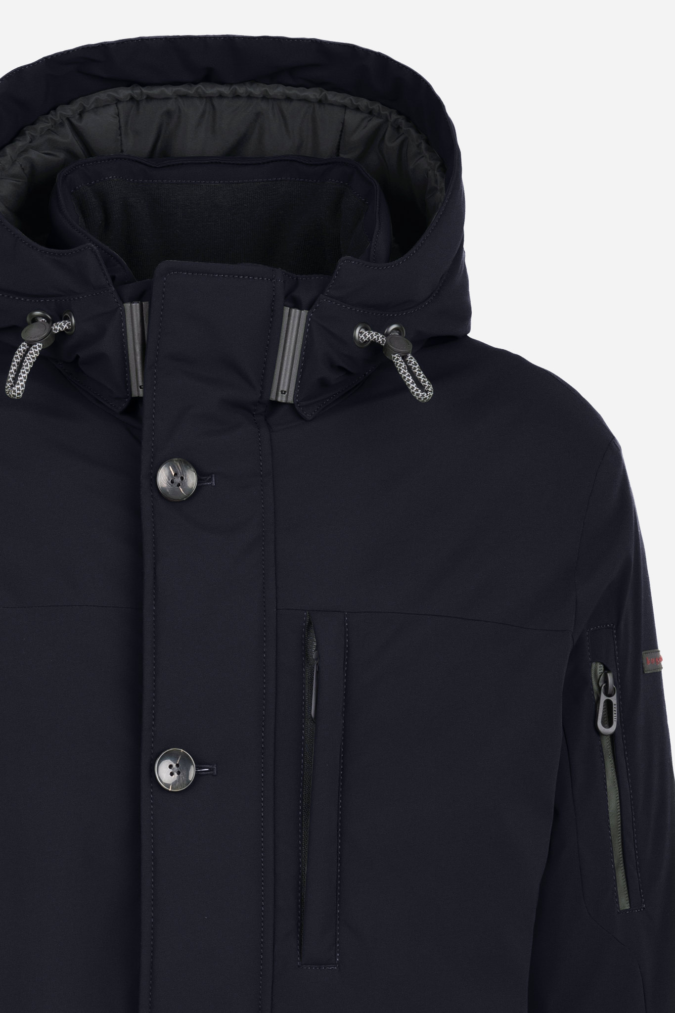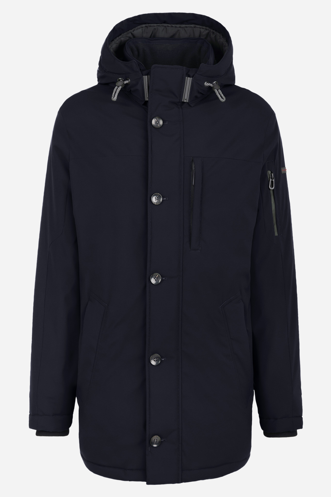 Με αποσπώμενη κουκούλα και κλείσιμο με κουμπιά και φερμουάρ μέχρι το γιακά.