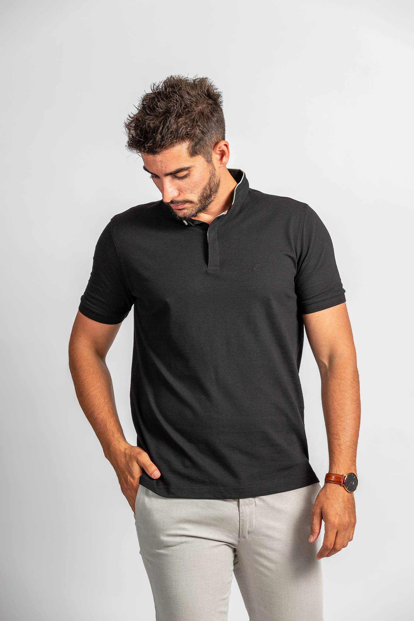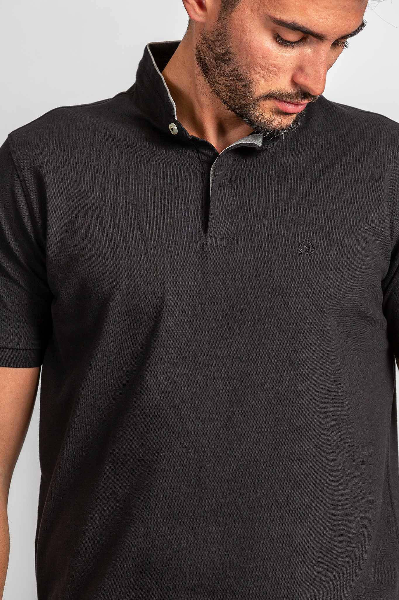 Πικέ ύφασμα με λεπτομέρειες από γκρι ρέλι στο γιακά και στην πατιλέτα.