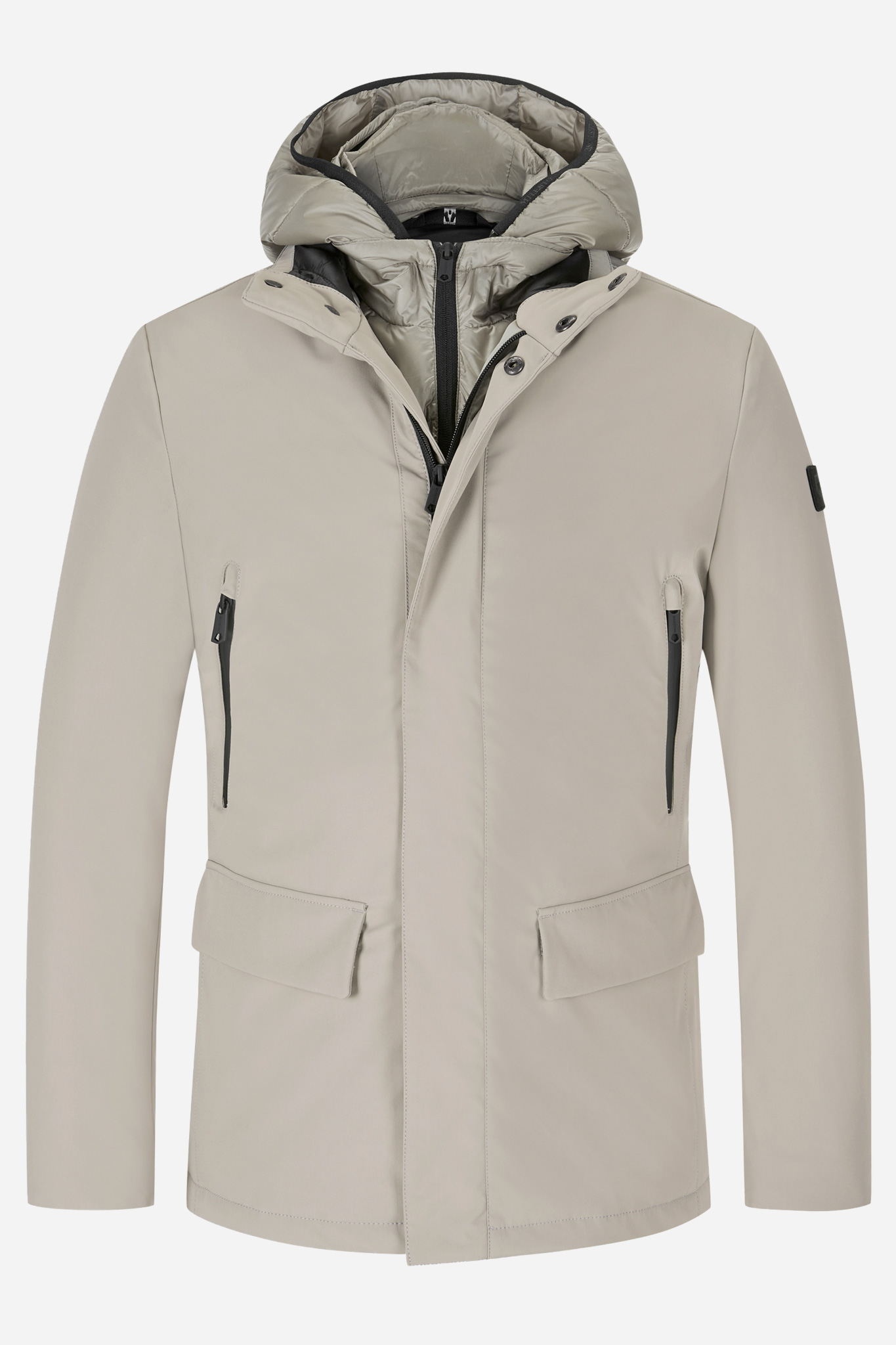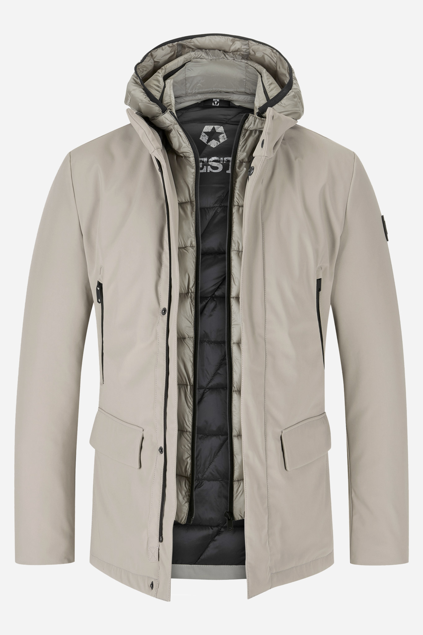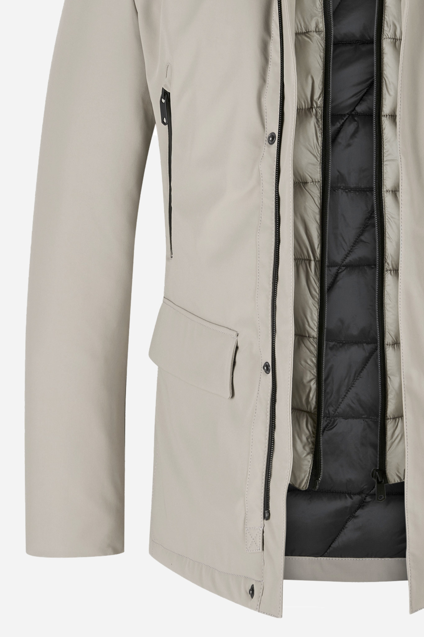 Σε casual chic ύφος, με κουκούλα που αφαιρείται και αποσπώμενη μόστρα σε στυλ γιλέκου.