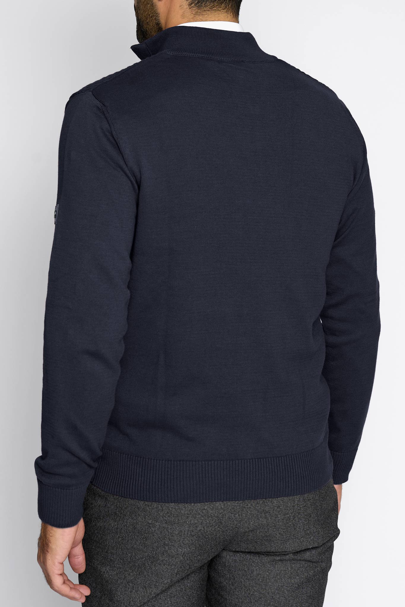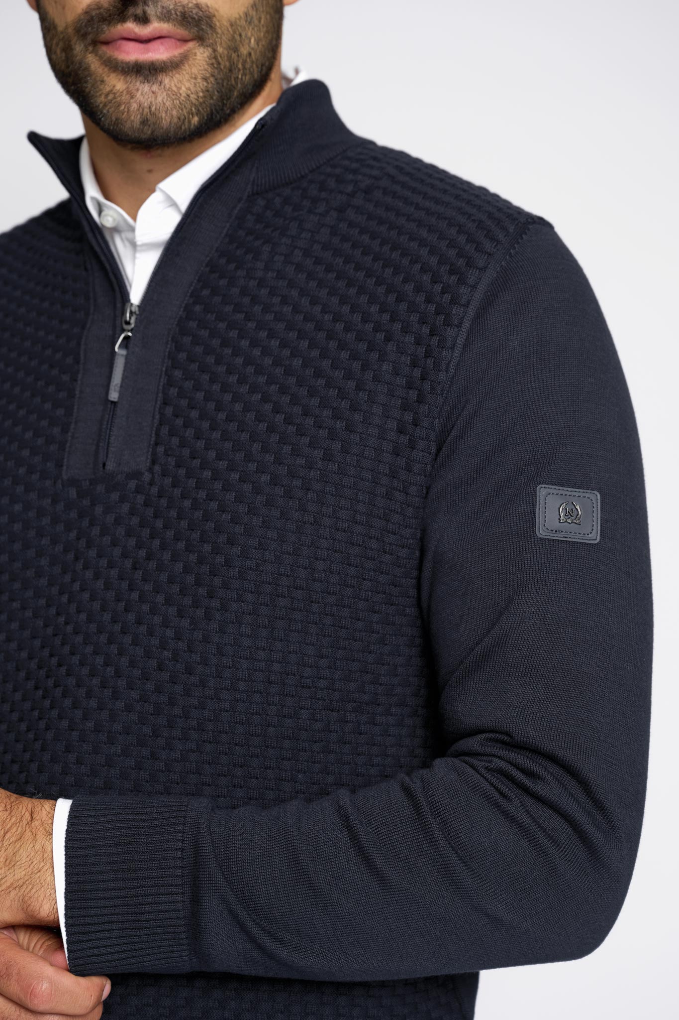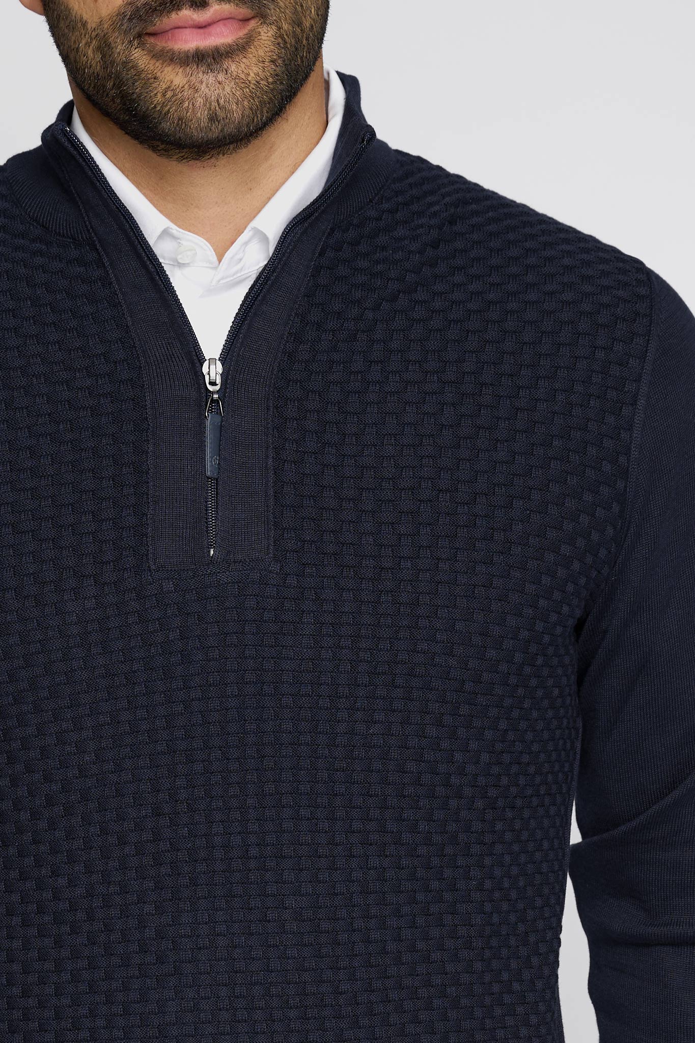 Με ανάγλυφη jacquard πλέξη στο σώμα εμπρός και όρθιο γιακά λουπέτο με φερμουάρ και κλείσμο μέχρι πάνω.