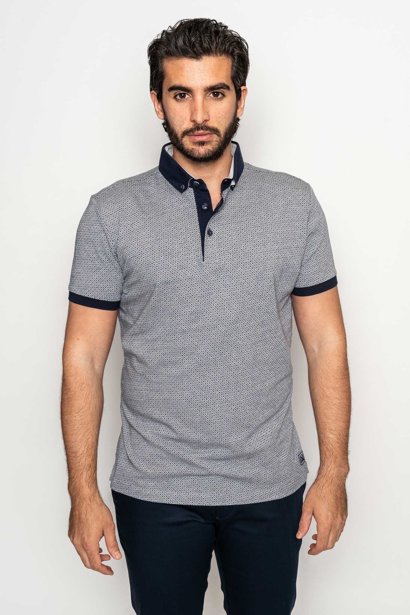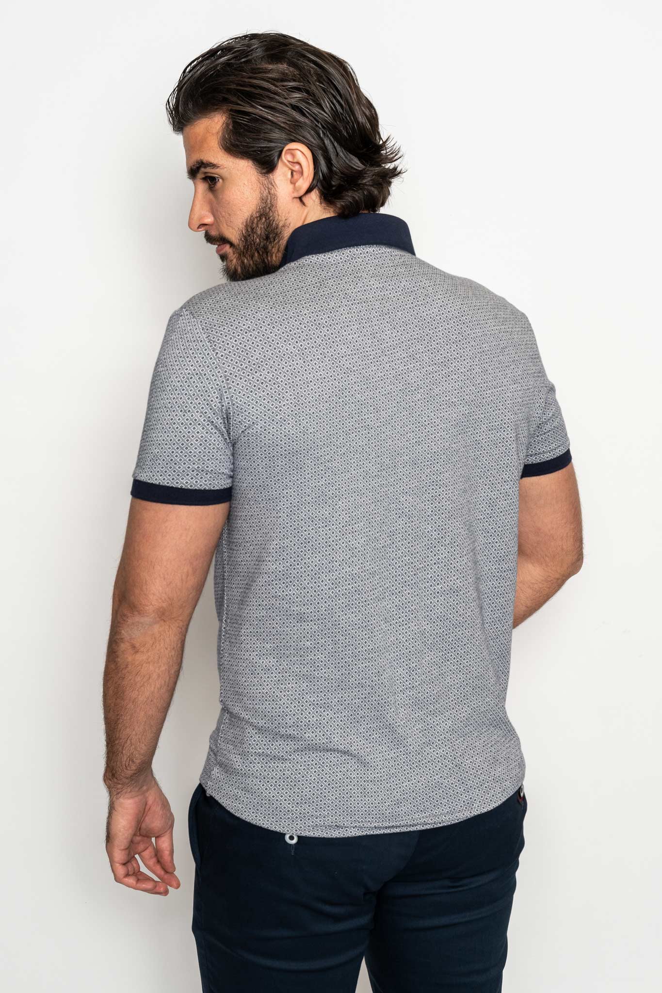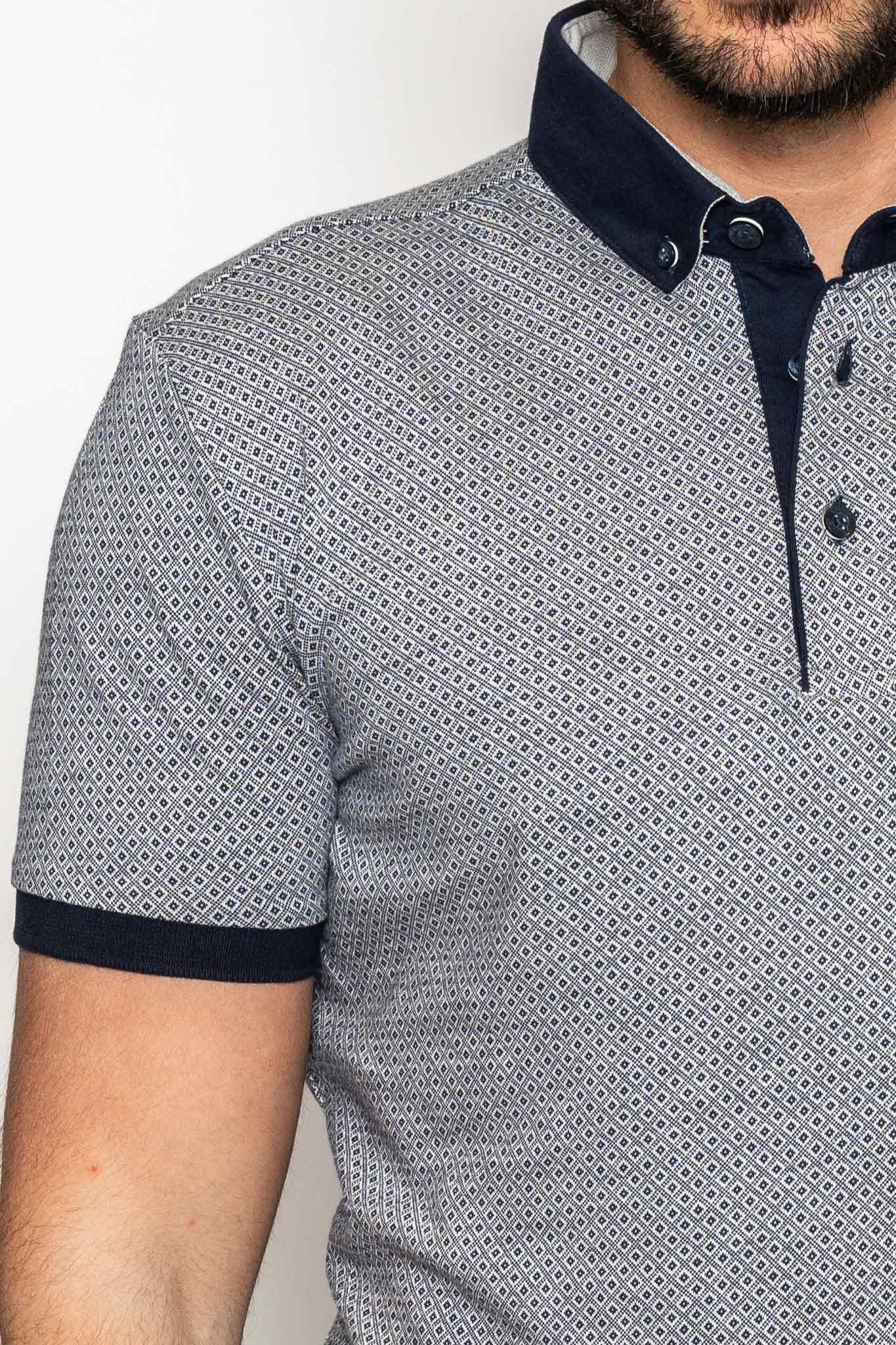 Μικρο-μοτίβο στην ύφανση με contrast μπλε γιακά και λάστιχο στο μανίκι.