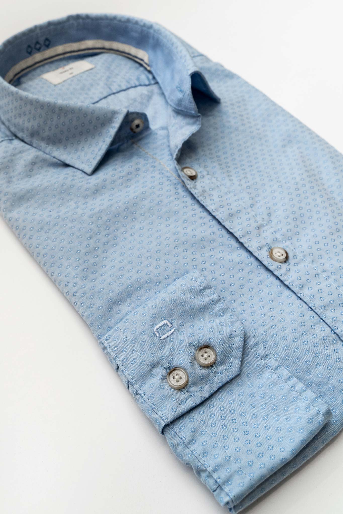 Υφαντό μικρο-μοτίβο σε απαλή σιελ απόχρωση και contrast κοκάλινα κουμπιά.
