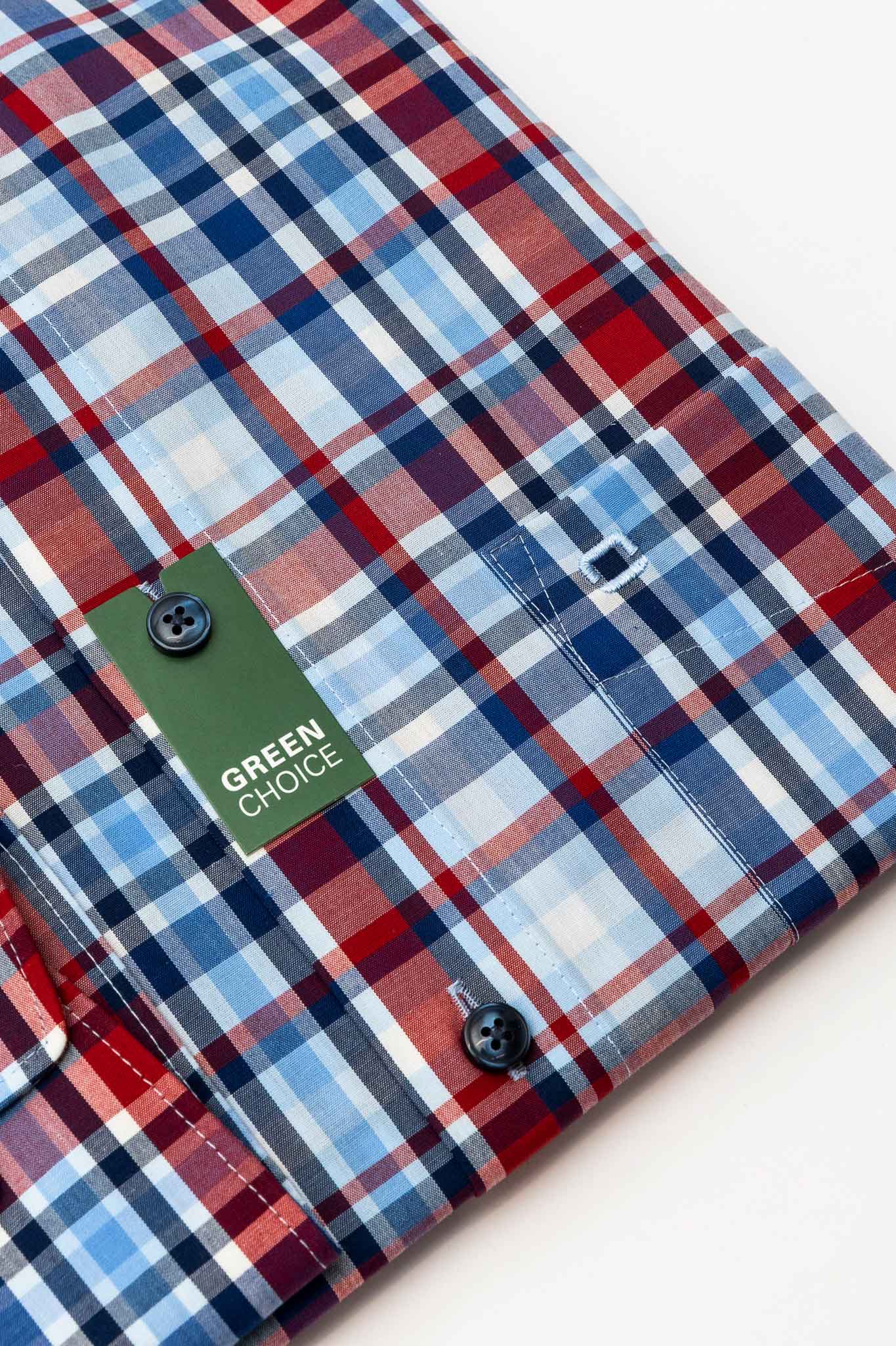 Με καρό σχέδιο σε έντονο κόκκινο-μπλε χρώμα και μπλε κουμπιά.