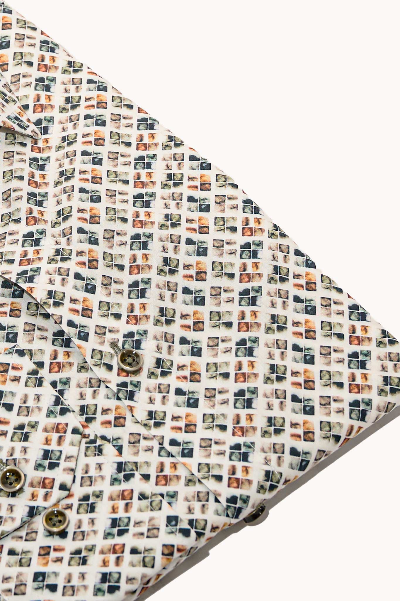 Με print γεωμετρικό μοτίβο σε πράσινο-ταμπά τόνους και κουμπιά σε contrast χρώμα.